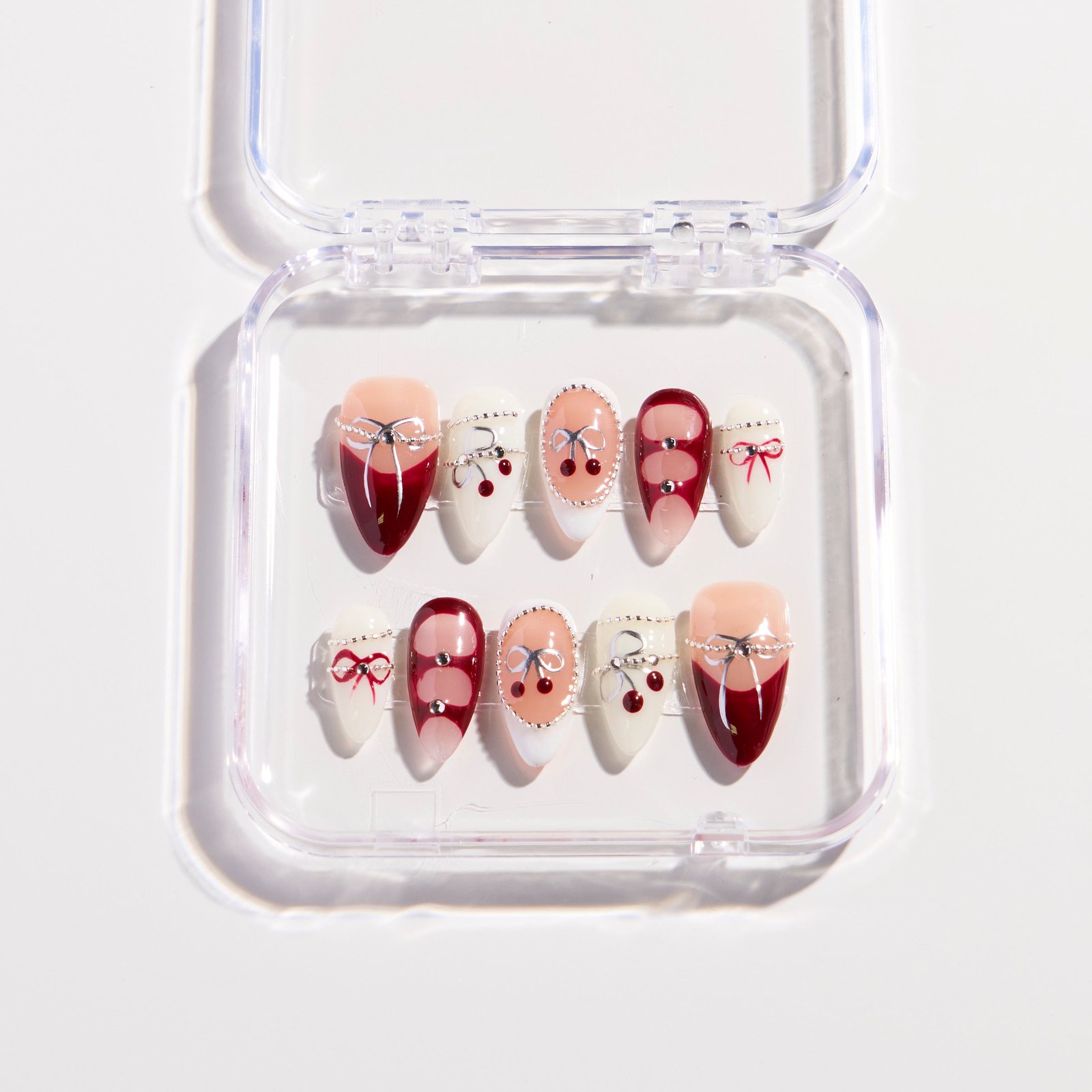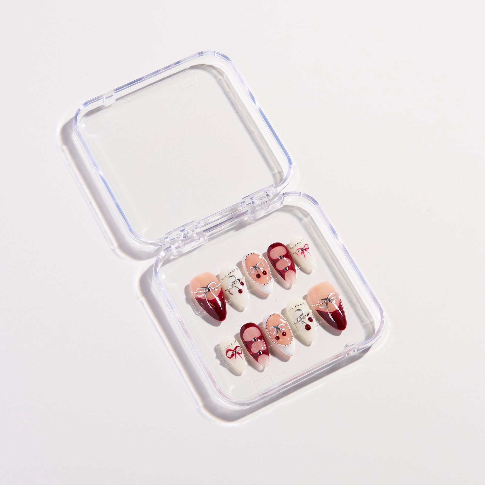 This Crimson Chain press-on nail set features a softly gradient base of light nude pink and deep red, paired with cherry, red bow and thin chain embellishments. Sweet elements interweave with vintage red tones, exuding a playful vibe that is both edgy-sweet and exquisite.