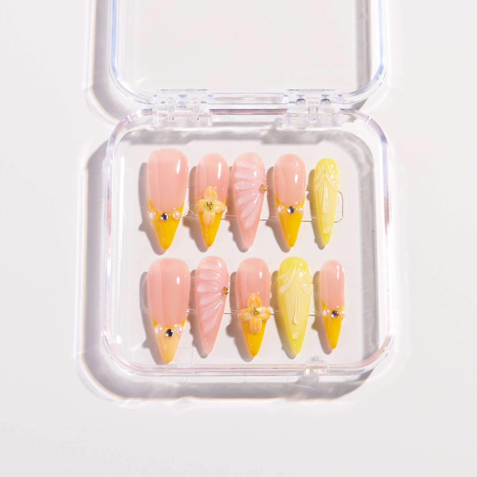 This Lemon Breeze press-on nail set features a translucent gradient base of light pink and lemon yellow, paired with 3D flowers, spiral textures and sparkling diamond embellishments. The fresh lemon-themed elements interweave to create a bright and gentle summer vibe.