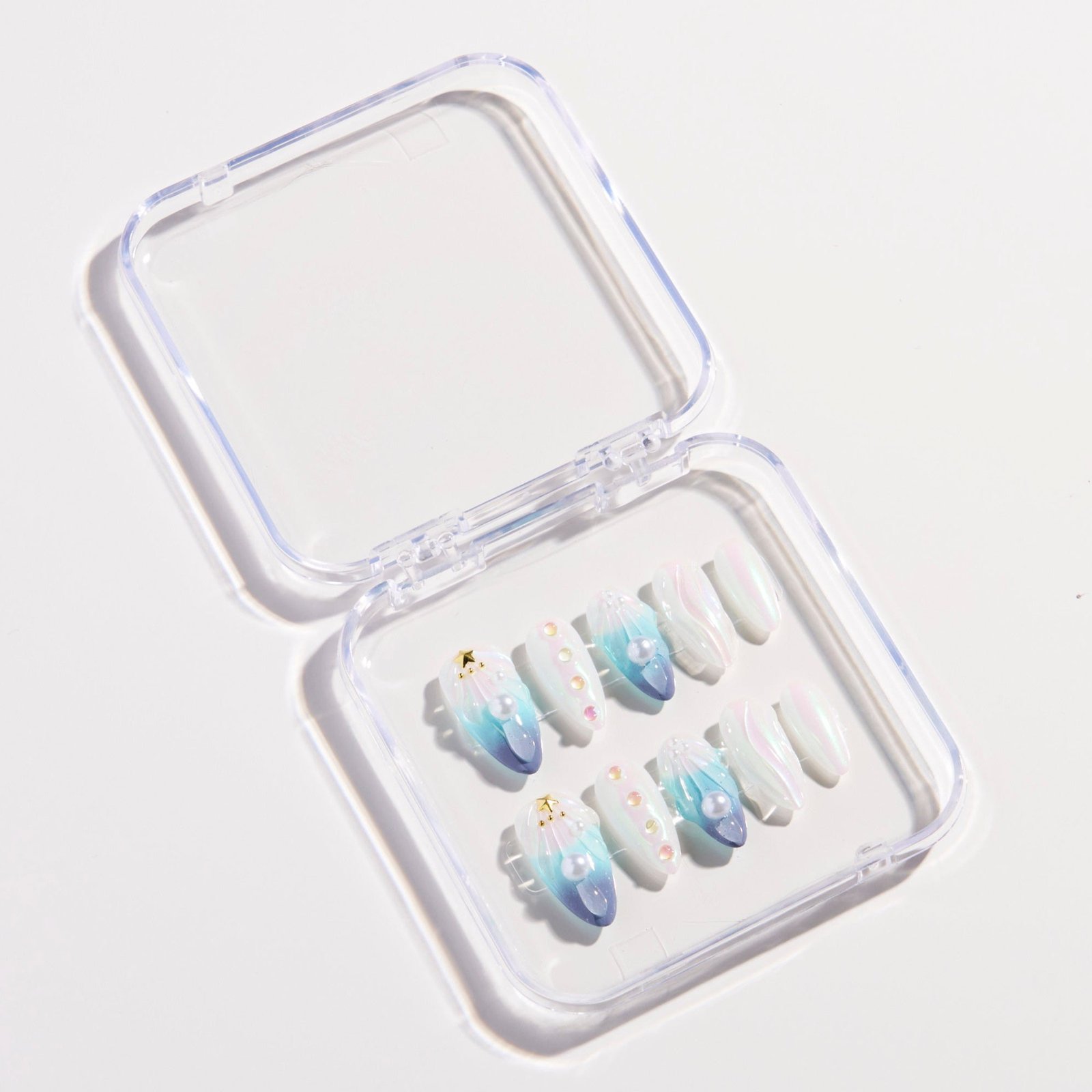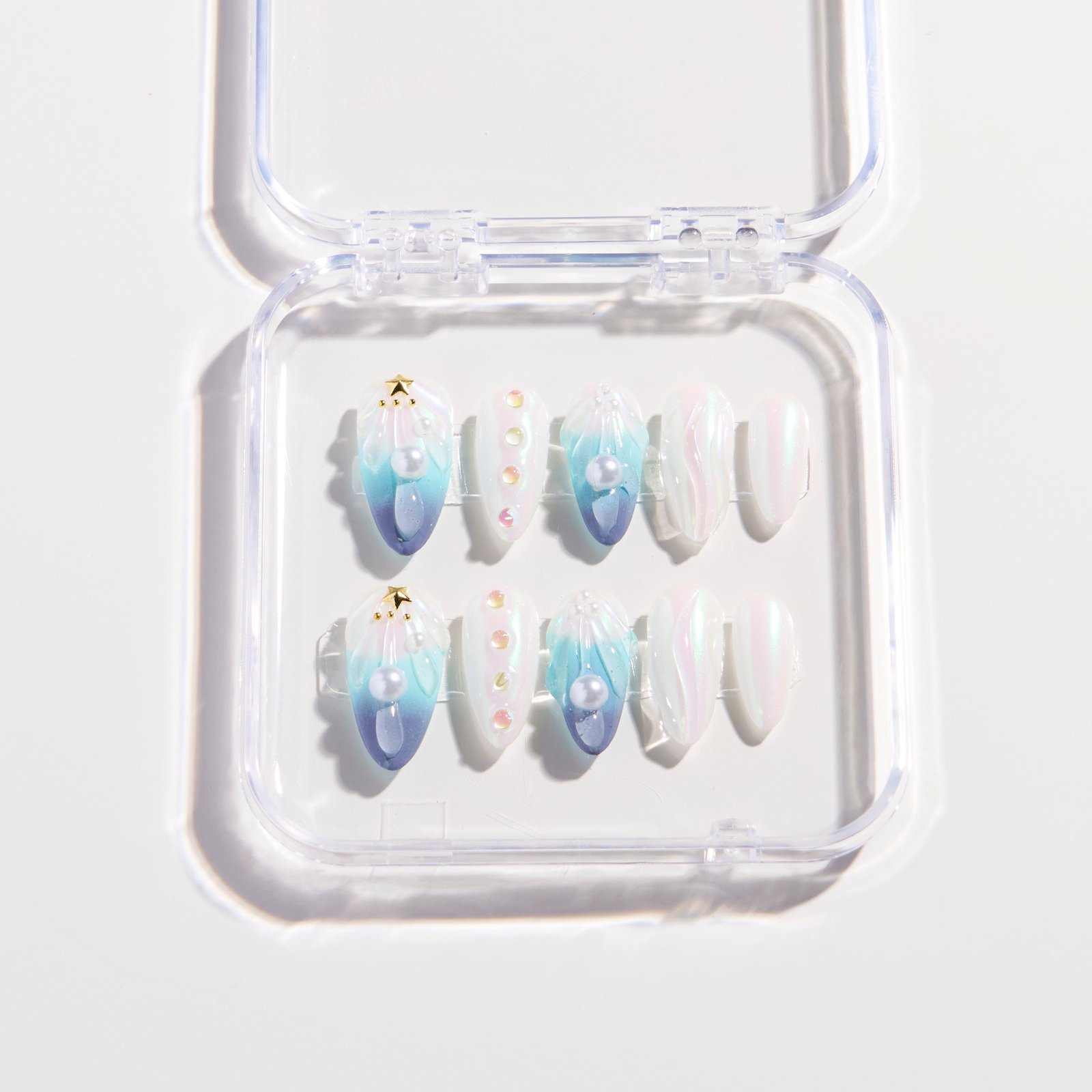 This Ocean Siren press-on nail set features a translucent blue-and-white gradient base, paired with pearls, gold accents, and glitter details. The ocean-inspired hues interweave with exquisite, luxurious elements, exuding an elegant and dreamy “deep-sea siren” vibe.