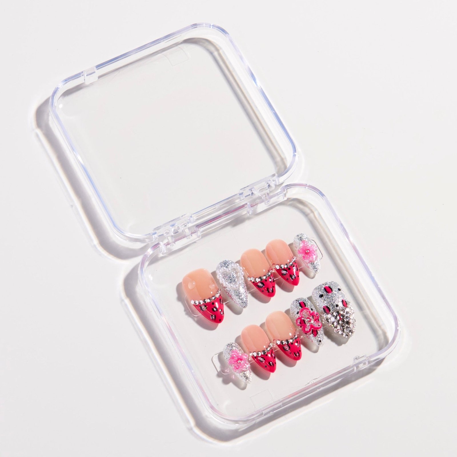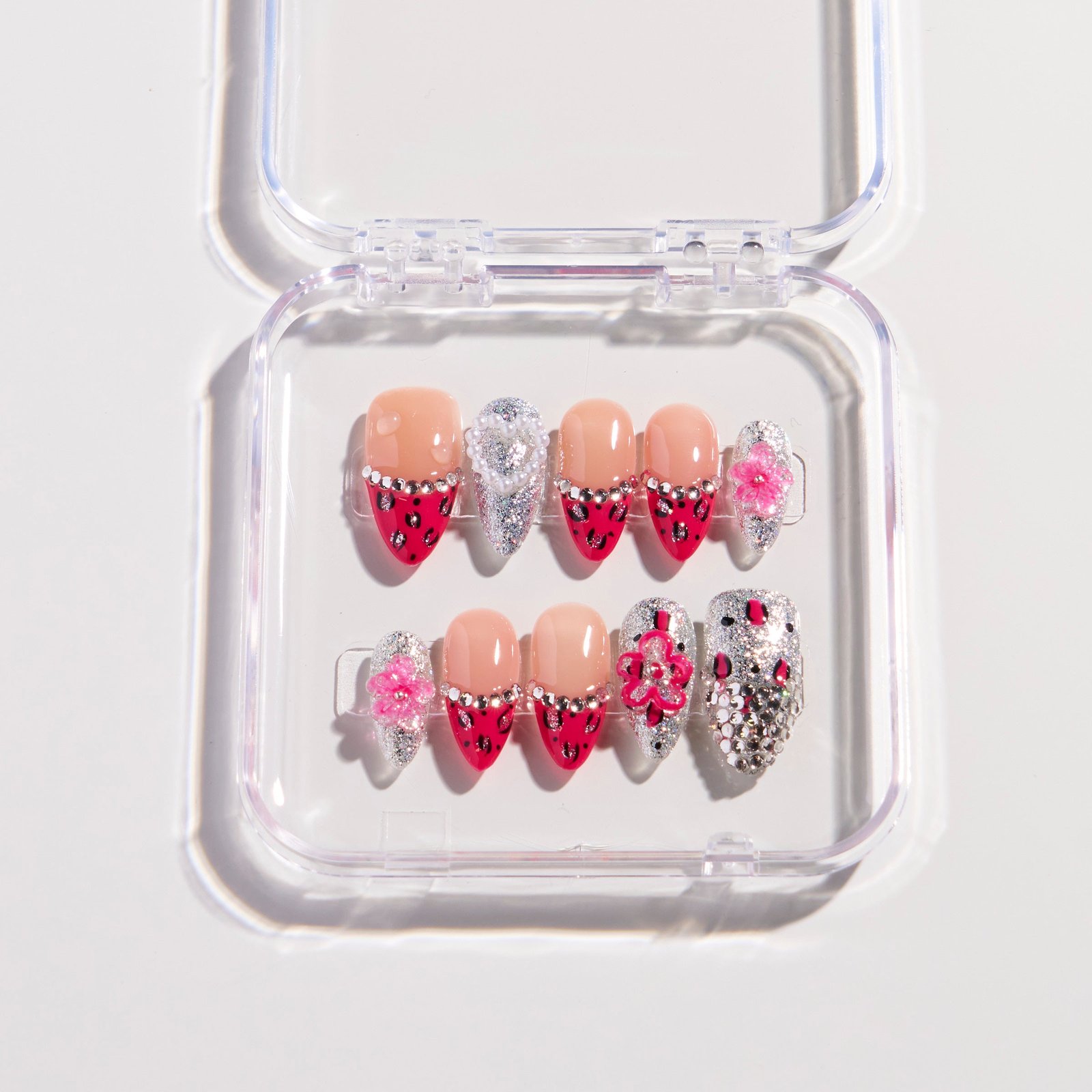 The Rogue Sparkle press-on nails feature a nude pink base, paired with diamond-encrusted red strawberry decorations, full-diamond nail surfaces, and pink flower elements. Adorned with shimmering rhinestones, the sweet elements interweave with a bold, sparkling vibe, perfectly showcasing the eye-catching charm of a sweet, cool, and sassy style.