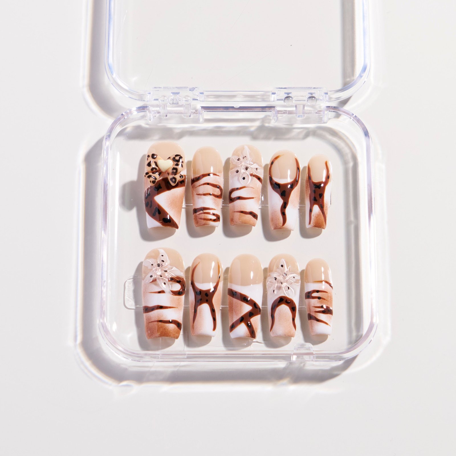 The Starfish Cream press-on nails feature a creamy base blending milk coffee and off-white hues, paired with starfish decorations, leopard print patterns, and flowing brown-coffee stripes. The soft creamy tones are intertwined with subtle edgy details, exuding a lazy yet sophisticated vibe.