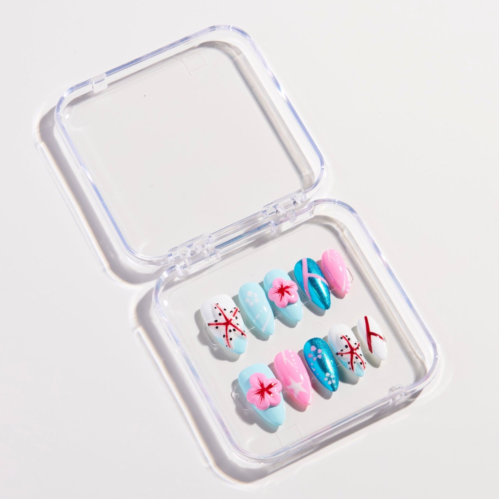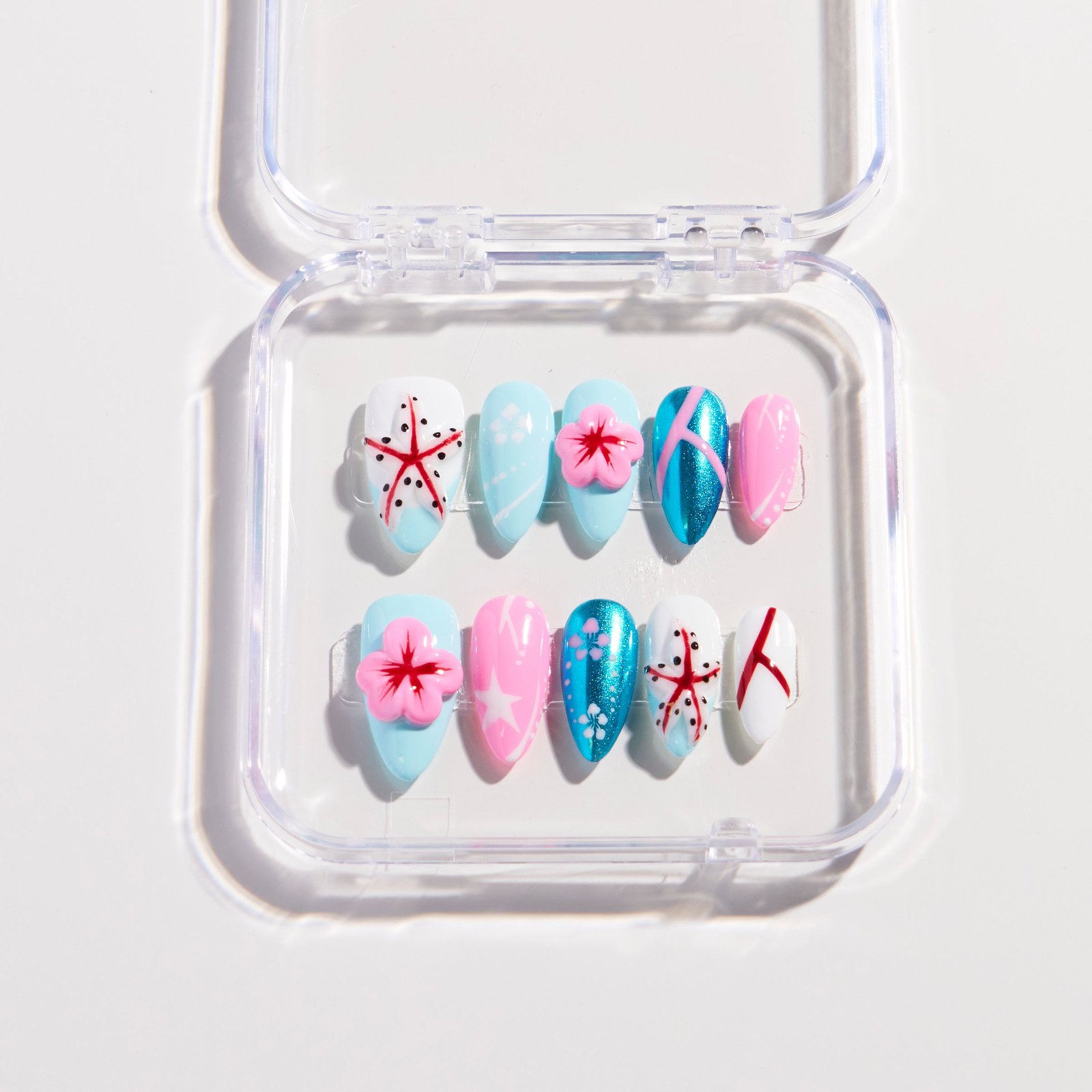 This Starfish Dream press-on nail set features a fresh color base of light blue, pink, and white, paired with red-patterned starfish, 3D pink flowers, glitter, and blue-white gradient details. These fresh elements interweave to create a dreamy tropical island vibe.